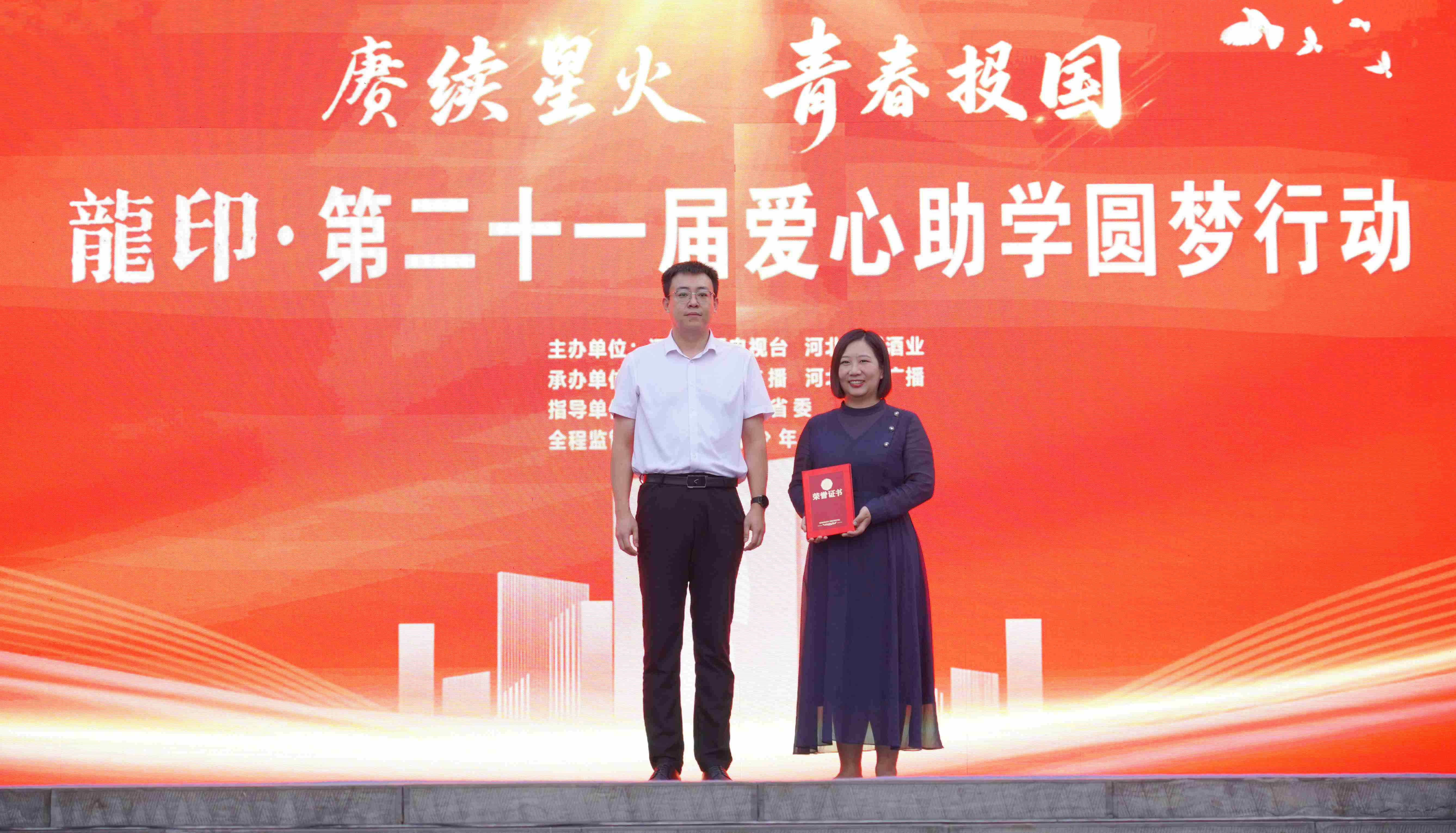 河北廣播電視臺副總編輯邊宇峰、板城酒業(yè)銷售市場總監(jiān)王曉波登臺為學子頒發(fā)助學金。